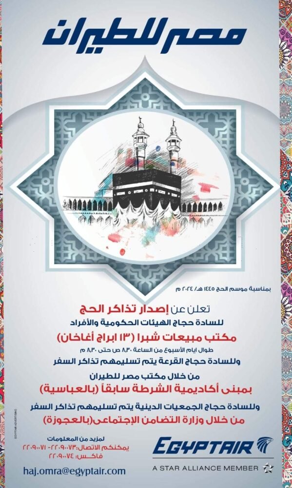 في إطار استعدادات الناقل الوطني مصر للطيران لموسم الحج هذا العام 1445هـ – 2024م ، تعلن مصر للطيران عن بدء إصدار تذاكر حجاج بيت الله الحرام إعتبارًا من أمس 11 مايو وحتي 10 يونية، من خلال تخصيص 3 مكاتب فقط تابعين للشركة وهي مكتب (شبرا) لإصدار تذاكر حجاج السياحة والأفراد والهيئات المختلفة والجهات الحكومية ومكتب للشركة بمبني أكاديمية الشرطة سابقًا (بالعباسية) لإصدار تذاكر حجاج القرعة ومكتب في مقر وزارة التضامن الإجتماعي (بالعجوزة) لإصدار تذاكر حجاج الجمعيات الدينية.