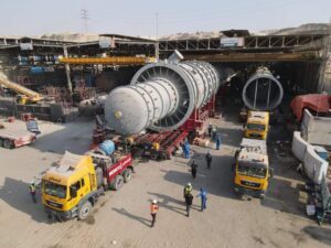 وتبدأ اليوم رحلة نقل البرج والمفاعل العملاقين في إتجاه السويس حيث ستقوم فرق عمل شركة بتروجت أعمال تركيبهما داخل المشروع الجديد .
