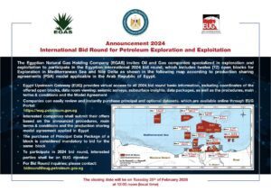 وفي سياق متصل، أعلنت وزارة البترول والثروة المعدنية عن قيام الشركة المصرية القابضة للغازات الطبيعية (إيجاس) بطرح مزايدة عالمية جديدة لعام 2024 للبحث عن الغاز الطبيعي والزيت الخام في 12 قطاعًا بالبحر المتوسط ودلتا النيل، تشمل 10 قطاعات بحرية وقطاعين بريين، وذلك من خلال بوابة مصر للاستكشاف والإنتاج (EUG) عبر الرابط التالي: https://eug.petroleum.gov.eg.
