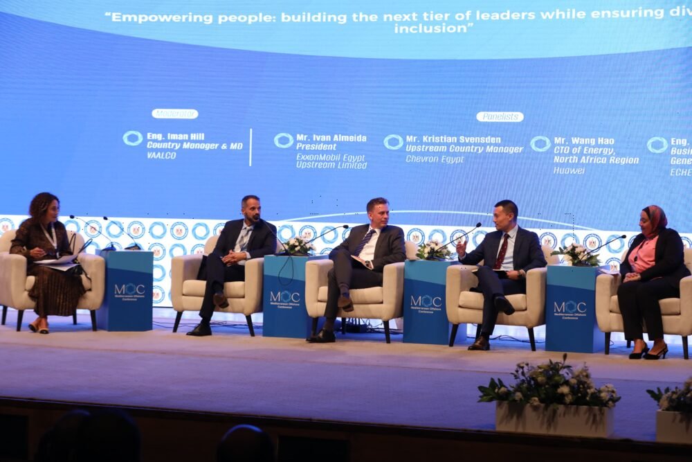 عقد مؤتمر حوض البحر الأبيض المتوسط MOC 2024 جلسة حوارية بعنوان ( تمكين العاملين : بناء جيل جديد من القادة مع ضمان التنوع والادماج ) والتي أدارتها المهندسة ايمان هيل المدير الاقليمى والمدير العام لشركة فالكو ، بمشاركة ايفان الميدا رئيس شركة اكسون موبيل مصر للبحث والاستكشاف ، و كريستيان سفنسدن الرئيس الاقليمى لشركة شيفرون مصر للبحث والاستكشاف ، ووانج هاو رئيس شركة هاواوى للتكنولوجيا بمنطقة شمال افريقيا ، والمهندسة ريهام محمد مدير عام تنمية الاعمال بالشركة المصرية القابضة للبتروكيماويات .