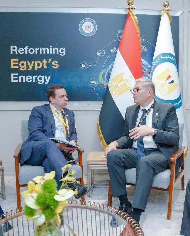 عقد المهندس كريم بدوي، وزير البترول والثروة المعدنية، جلسة مباحثات مع جويدو بروسكو الرئيس التنفيذي لعمليات الموارد الطبيعية بشركة إيني الإيطالية. بحضور المهندس معتز عاطف وكيل الوزارة للمكتب الفني والمتحدث الرسمي للوزارة.