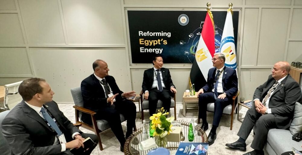 التقي المهندس كريم بدوي وزير البترول والثروة المعدنية مع وليام لين نائب الرئيس التنفيذي لشركة بي بي العالمية لشئون الغاز والطاقة منخفضة الكربون، بحضور المهندس نادر زكي الرئيس الإقليمي لشركة بي بي للشرق الأوسط و شمال أفريقيا و المهندس معتز عاطف وكيل الوزارة للمكتب الفني والمتحدث الرسمي للوزارة.