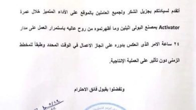 “سيدي كرير” تشكر” بترومنت “على الأداء المتميز خلال عمرة Activator بمصنع البولي إيثيلين